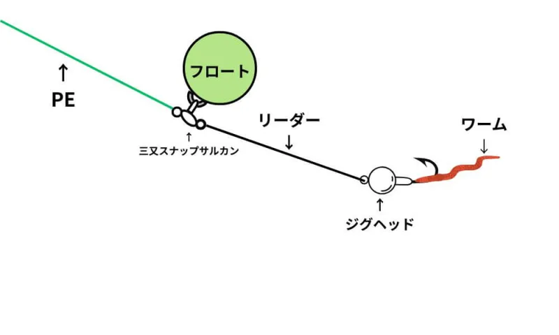 ロッド → リール → メインライン → フロート用スナップサルカン → リーダー → ジグヘッド → ワーム